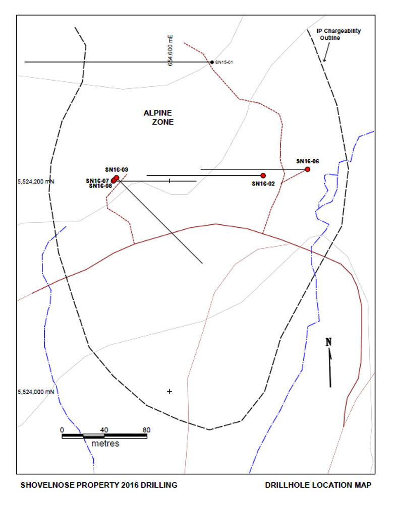 All drill holes (SN16-06 to SN16-09) were collared in the southern portion of the recently discovered Alpine Zone. The Alpine Zone occurs as an 800 metre long IP chargeability anomaly discovered in 2015. Drill hole SN16-02, from the spring 2016 drill program intersected quartz veining and silicification in rhyolitic tuffs from bedrock surface to 142 metres depth grading 0.27 g/t gold (Au) over 119.6 metres including; 0.5 metres of 16.7 g/t Au and 29.9 g/t silver (Ag); and 0.6 m of 4.95 g/t Au and 43.7 g/t Ag. The objective of the current program was to determine size and geometry of gold mineralization encountered in previous drilling.