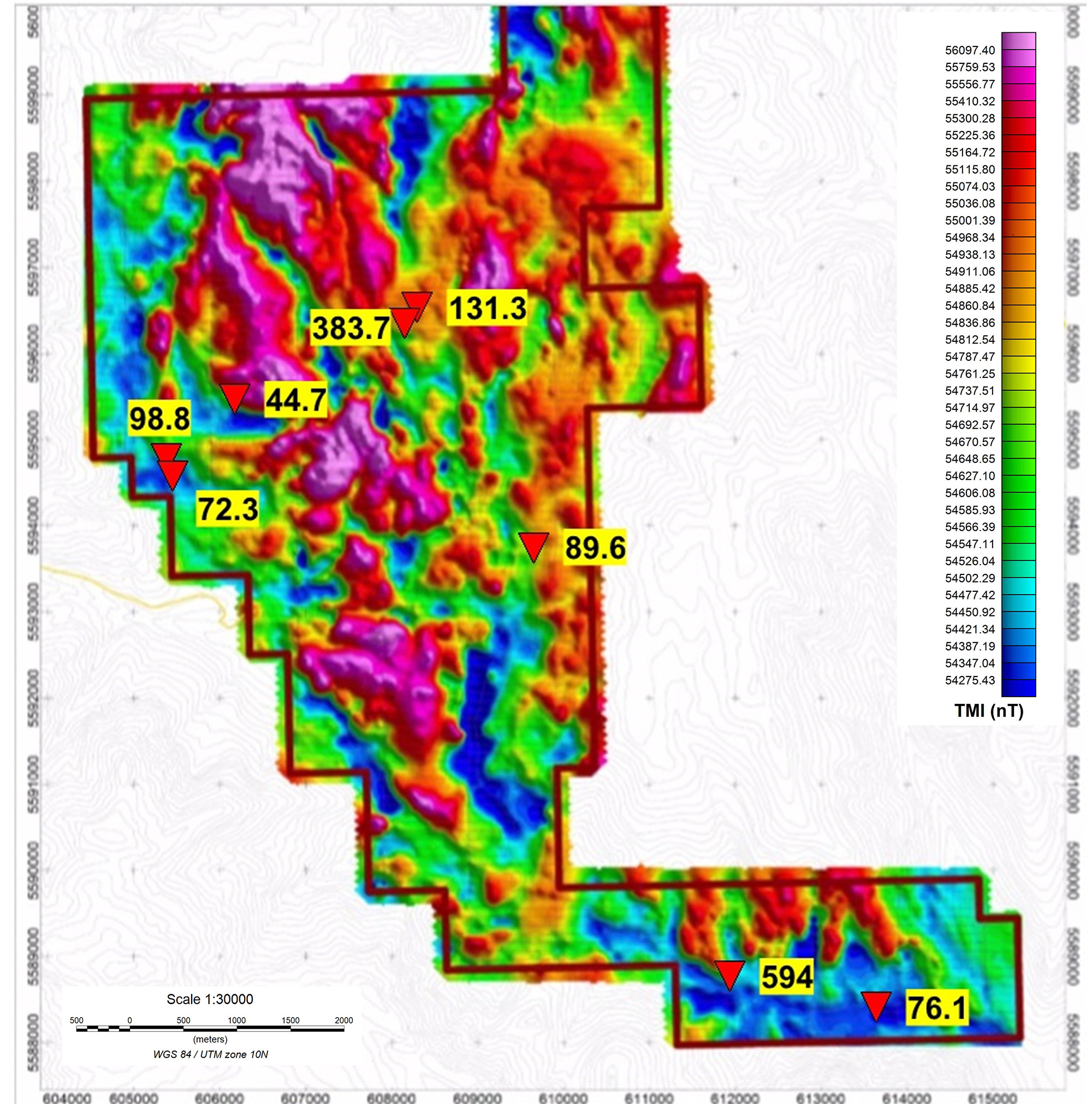 The Skoonka North claims encompass the highest gold-in-silt samples on the SBGB, including 594 parts per billion (ppb) gold (Au), 383.7 ppb Au, and 131.3 ppb Au. The claims have seen limited exploration work and have yet to be drill tested. The airborne geophysics survey was successful in outlining multiple linear magnetic lows. Several of these magnetic low signatures occur within the anomalous gold catchment basins.