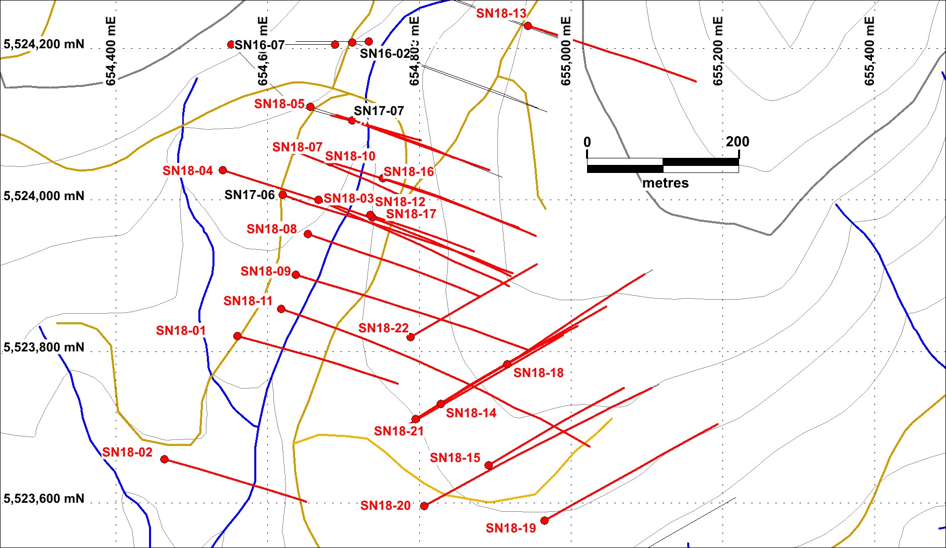SN18-20 intersected the projected down-dip extension by 140m of Zone 1 mineralization encountered in hole SN18-15. SN18-20 is collared 100m southwest from SN18-15 which returned 46.20m of 8.95 g/t Au and 65.47 g/t Ag. A second zone of banded quartz veining was encountered in SN18-20, 100m down-section of Zone 1, and likely represents Zone 2. SN18-21 intersected the projected down-dip extension by 50m of the Zone 1 mineralization encountered in hole SN18-14 and is located 38m to the southwest. Hole SN18-21 also encountered the projected down-dip extension by 170m of Zone 2 veining intersected in SN18-18. SN18-22 is collared 100m to the northwest of SN18-14 and it encountered the northwestward continuation of vein zones 1 and 2. Please see a plan map of the drilling program below.