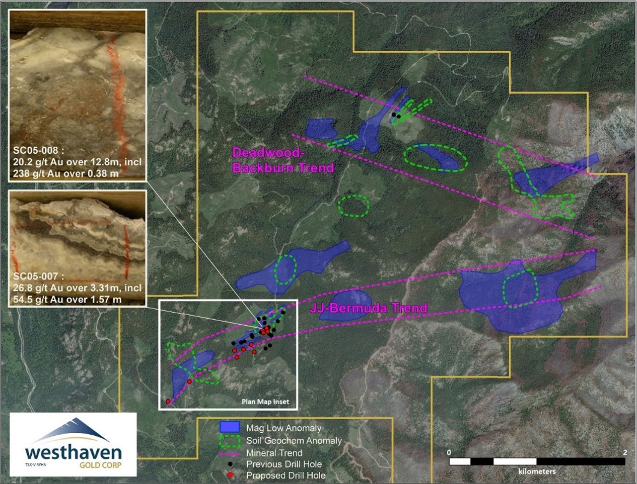 Past prospecting activities targeted gold-in-soil anomalies and often successfully identified bedrock exposures of gold mineralization and/or related alteration. These surface showings became the focus of historical exploration. Six original showings were subsequently tested by drilling (Discovery, Deadwood, Ember, Backburn, Backburn Southeast and JJ), but other known bedrock occurrences remain undrilled (e.g. Bermuda and Zebra). The source of additional prominent gold-in-soil targets, as well as anomalous gold mineralization in rock samples, is not currently known and these features are considered exploration targets. Westhaven acquired the Skoonka property in 2017 and, prior to its inaugural drill program in 2022, had completed geophysics, mapping, and prospecting. In addition to the previously identified zones of mineralization, Westhaven has identified new areas of interest that, when integrated with prospecting, geophysics and drilling, may lead to the discovery of additional new veining.