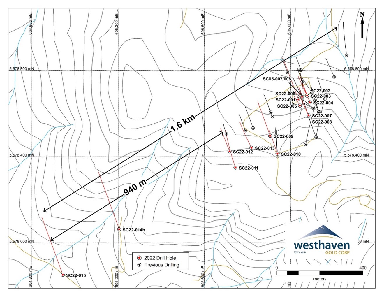 Westhaven completed 3 drill holes at the JJ-West exploration target. These holes are following up on targets generated by early field work performed by Westhaven in 2017, which identified a magnetic low with coincident high level geochemical pathfinders, including mercury, on-trend with the JJ vein zone. All three holes intersected quartz veining that is now interpreted to be the southwestern continuation of the JJ zone. Hole SC22-015 is the most southwestern hole completed and it intersected a zone of veining from 160m downhole to 228m including white to pale-grey chalcedony veining including ginguro. The quartz vein system has now been extended with the drilling of these three holes to the southwest by an additional 940m, giving the zone a total strike length of 1.53km. The trend remains open to the northeast and southwest.