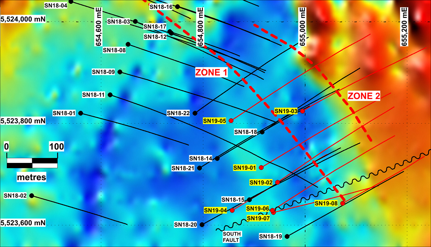 Hole SN19-06 confirmed the southeastward continuity of Zone 1, now with a drilled strike-length of 490 metres extending from hole SN18-07 southeast at a strike of 135 degrees to hole SN19-06.