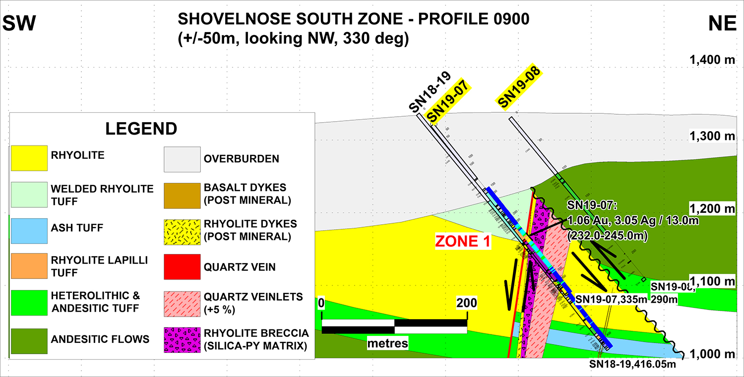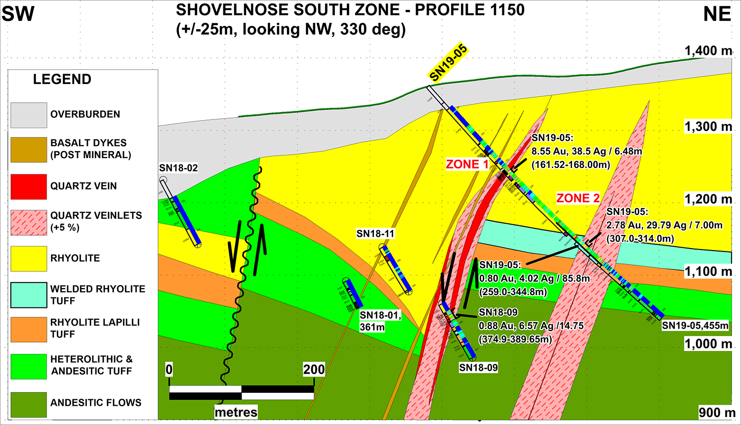 Peter Fischl, Exploration Manager, stated, “This program is noted for continuing to return bonanza gold grades, including the best hole ever drilled at Shovelnose, hole SN19-01 (39.31 g/t Au over 12.66m, 497 gram-metres Au) and for confirming the potential for mineralization in the south fault block with the drilling of SN19-07. This hole has extended the strike-length of Zone 1 southeast into the south fault block for a total of 550 metres. Drilling is now planned to continue targeting the southeastern trend of Zone 1 into the south fault block in addition to the resistivity anomalies defined along the projected southeastward continuation of Zone 1.”