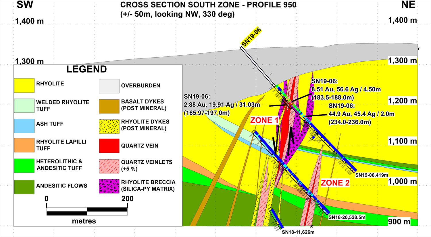 Hole SN19-08 was drilled in the south fault block as an upper cut to SN18-19, testing the shallower portions of quartz veining and silica-pyrite healed rhyolite breccia encountered in hole SN18-19. This hole encountered andesite and andesite tuff breccia over its length, suggesting the presence of a reverse fault that has uplifted andesite basement westward over the quartz veined and brecciated rhyolite and rhyolitic tuffs. This andesite body appears as a magnetic high flanking Zone 2 veining to the northeast in the north fault block.
