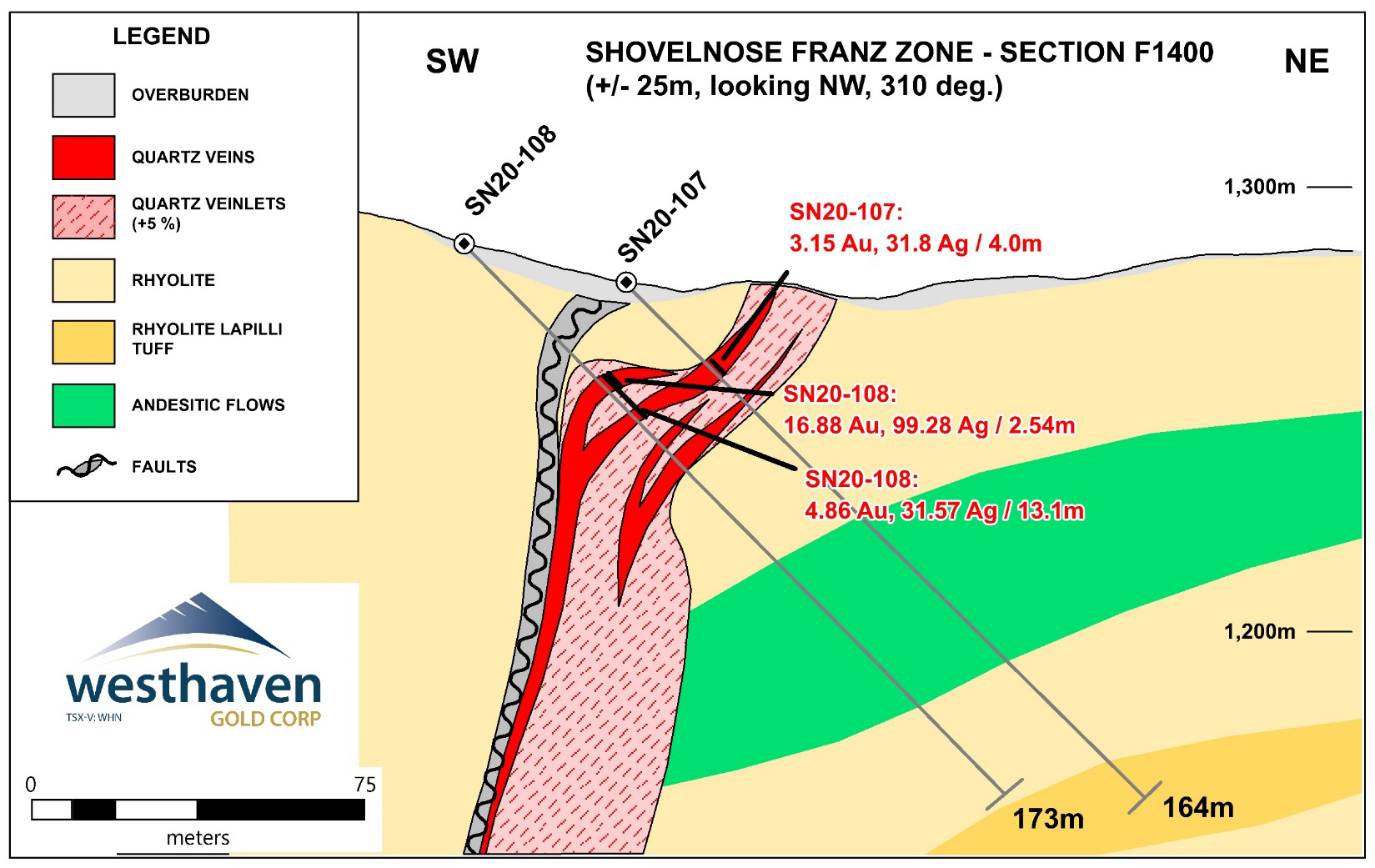 Gareth Thomas, President & CEO of Westhaven Gold stated: “We continue to intersect high-grade gold near surface at the newly discovered Franz Zone. These drill intercepts are along strike to the northwest of hole SN20-101, which assayed 7.78m of 14.84 g/t gold. Drilling continues to expand the size and continuity of the newly discovered Franz Zone. Gold mineralization has been traced for ~3.8km of strike length and remains open along strike. Given the property’s excellent location just off the highway, close to the city of Merritt, and with proximity to infrastructure, we can work the Shovelnose property year-round.”