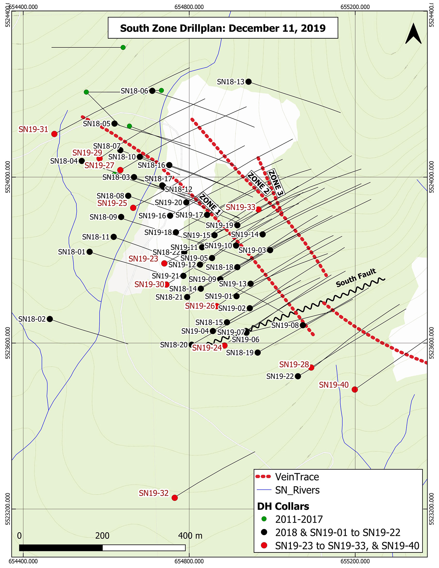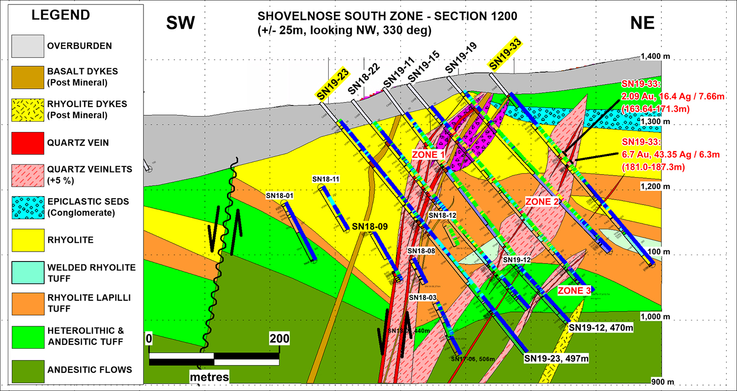 Hole SN19-33, which intersected 6.30 m of 6.70 g/t Au and 43.35 g/t Ag in vein zone 2, is an uppercut to Hole SN19-19, which returned 2.16 m of 100.50 g/t Au on section 1200. Hole SN19-33 is the shallowest intersection of Zone 2, centred at 1240 m elevation here. Follow-up drilling will test this level of Zone 2 on adjacent drill sections, where there appears to be better vein development in a shallower horizon of rhyolite bottoming out at about 1200 m level. An upper cut will be drilled to test for more rhyolite hosted veining up-dip towards the 1300 m level as well.