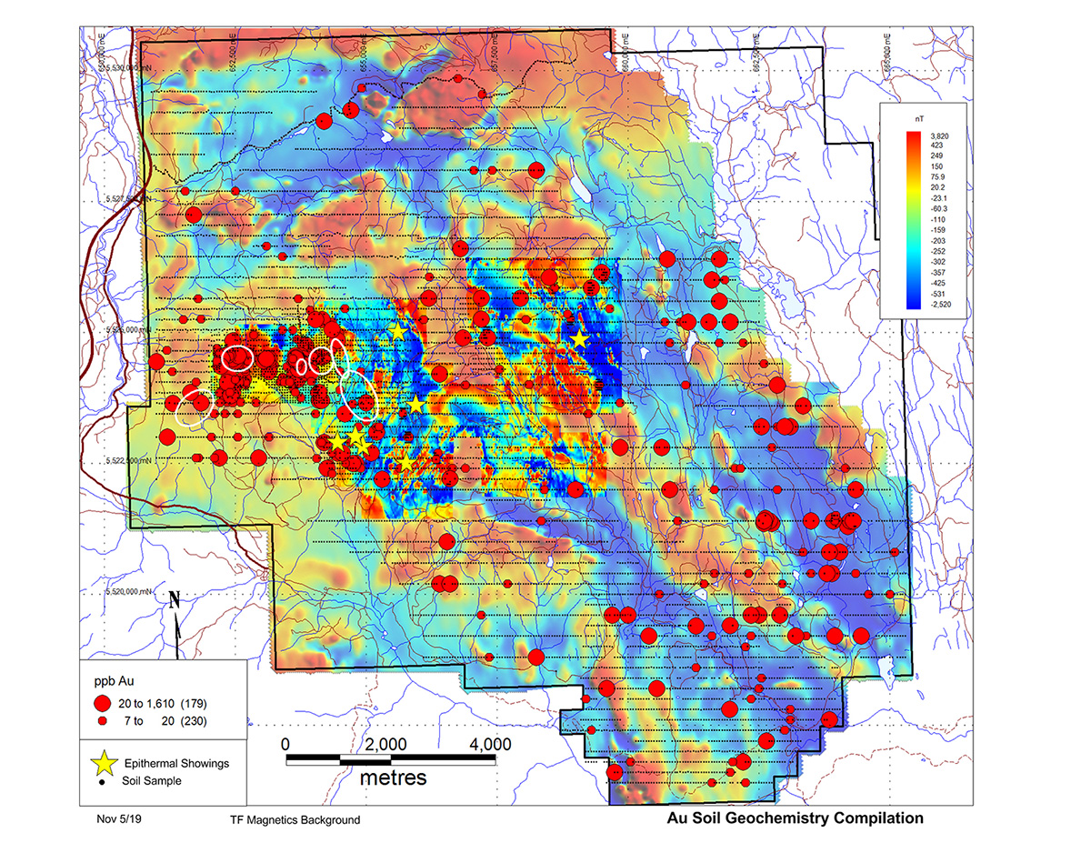 Drilling is now focused on Target D to test resistivity highs defined during a recently completed, DC resistivity survey. This survey spanned 19-line kilometres and extended to 1.5 km south of South Zone. These resistivity highs occur with coincident soil geochemical anomalies identified during detailed (100x50 m) grid sampling carried out this past summer. Drilling here will also test a northwest trending structural break between a magnetic high to the southwest and a magnetic low to the northeast.