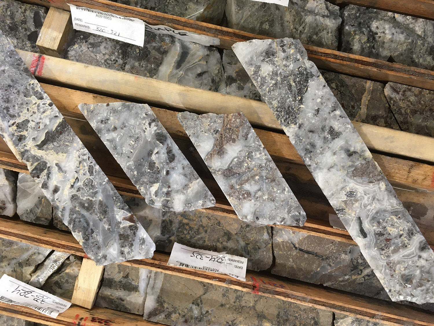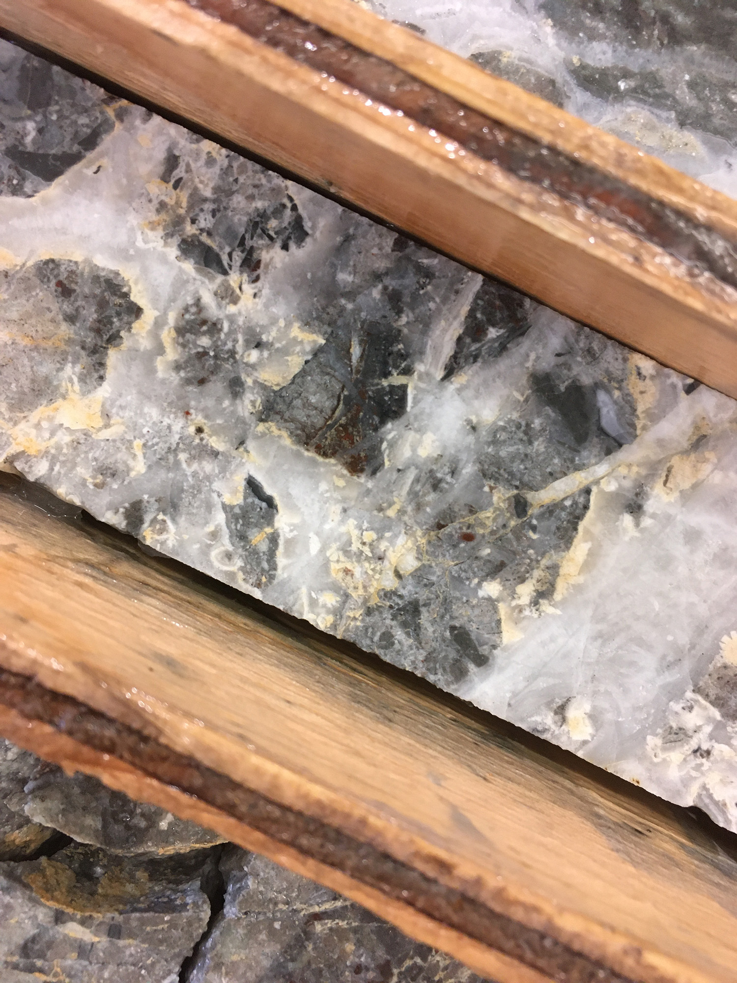 Hole SN19-40, drilled 80 m northeast as a step out from Hole SN19-36, encountered the vein zone in altered basement andesites but at a much shallower elevation. This andesite is likely in the footwall to the normal fault zone that hosts the vein system. The rhyolite in SN19-36 is in the down-dropped hanging-wall of the SW dipping normal fault. This suggests there is a down-drop of over 100 metres. This is the biggest displacement seen so far on this normal fault, strongly suggesting the vein system is present here at the south end, and management believes there is strong potential for the mineralized structure to continue to the southeast. The presence of mineralized quartz veins with adularia and ginguro (please see photos below) but with high silver to gold ratios (0.48 g/t Au and 81.00 g/t Ag) indicates this hole intersected the deeper portions of the boiling horizon. Shallower portions of this horizon will be targeted along strike in follow-up drilling.