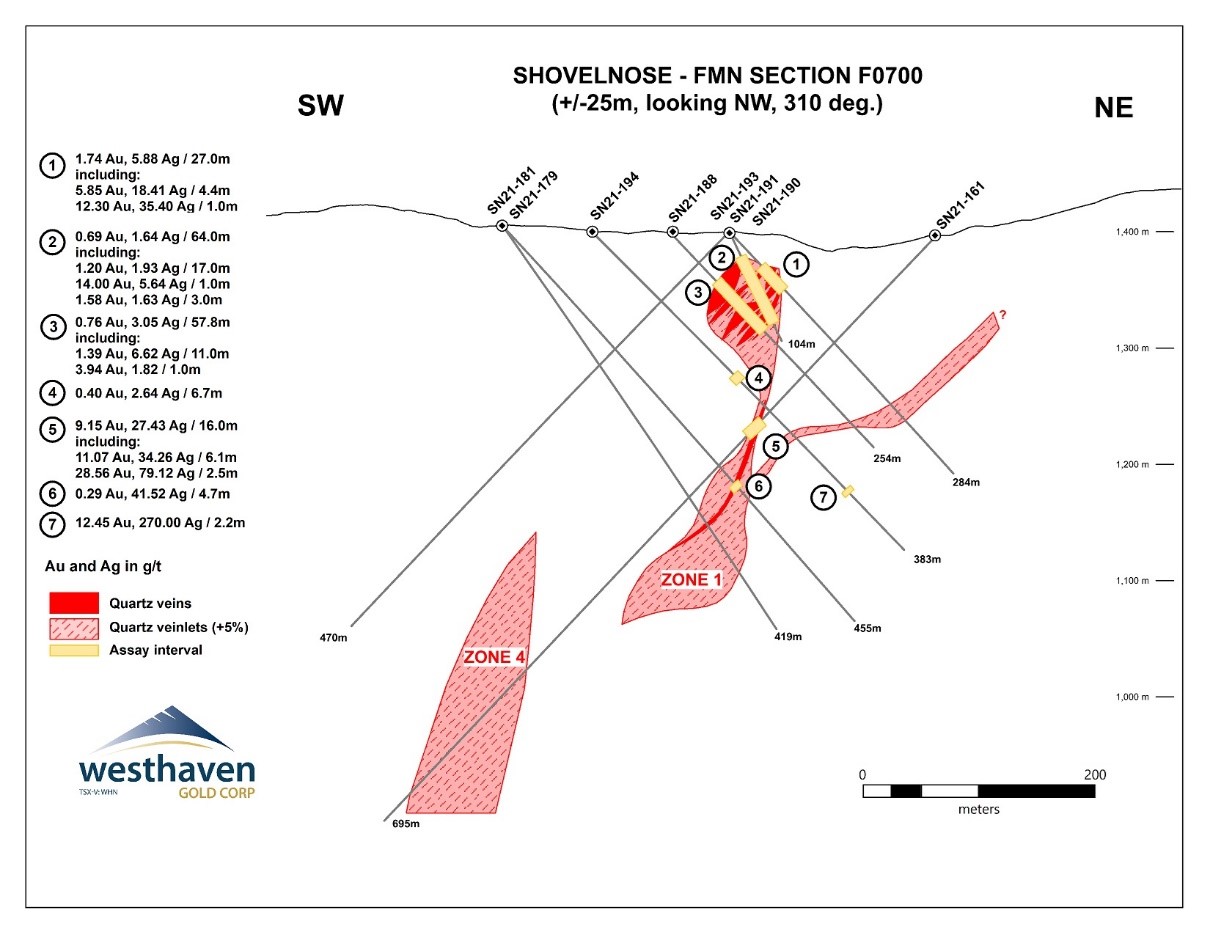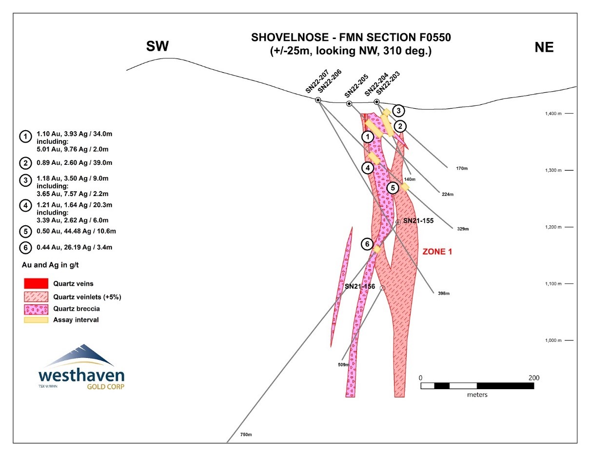 Peter Fischl, Exploration Manager, comments: “Drilling on the Shovelnose Gold Project started this year at FMN in order to follow-up on higher grade intersections from last year’s drilling (e.g. hole SN21-161: 9.15 g/t Au over 15.97m) and broader intervals of near-surface mineralization (e.g. hole SN21-188: 0.76 g/t Au over 57.8m). This year’s drilling at FMN continues to intersect these two styles of mineralization. Gold-bearing intervals are hosted in quartz-adularia veins comprising Vein Zone 1 and heterolithic breccias containing mineralized quartz fragments derived from Zone 1 veins. The breccias can form broad intervals of near surface gold mineralization such as in hole SN22-205 (1.1 g/t Au over 34.0m) and SN22-211 (1.16 g/t over 42.17m). Drilling continues to intersect higher grade intervals hosted in Vein Zone 1 as well, as seen deeper down in hole SN22-211 (9.52 g/t Au over 11.26m, including 30.25 g/t Au over 2.12m) and in SN22-212 (37.24 g/t Au over 23.03m). Drilling at FMN will continue on 50m spaced sections along strike towards the southeast to follow-up additional mineralization uncovered during 2020 drilling. A geophysical program is planned for FMN later this Spring to assist in targeting Vein Zone 1 between FMN and Franz to the northwest.”
