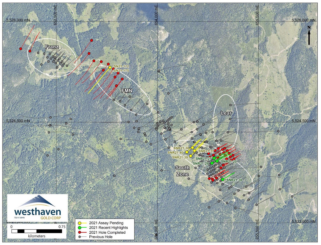 As a significant portion of the resource drilling has been completed at South Zone, the drill program is now focused on follow-up testing of stronger quartz veining seen in holes SNR21-37 to SNR21-40 in Vein Zone 1 in the northwestern portion of South Zone. Drilling will also take place northward towards the Lear target for infill and step-out drilling on Vein Zone 3. The FMN target remains a priority for follow-up drilling. Drilling will resume at FMN upon completion of the resource drilling at South Zone where the shallower portions of the mineralized horizon in Vein Zone 1 will be targeted at the 1200-1300m level. This will be following up the last hole drilled at FMN, hole SN21-175 (assays pending), which encountered quartz-adularia (+/- ginguro) veins contained in three subintervals of Vein Zone 1 spanning 246m downhole. Several CSAMT targets lying west of South Zone will be tested this fall as well.
