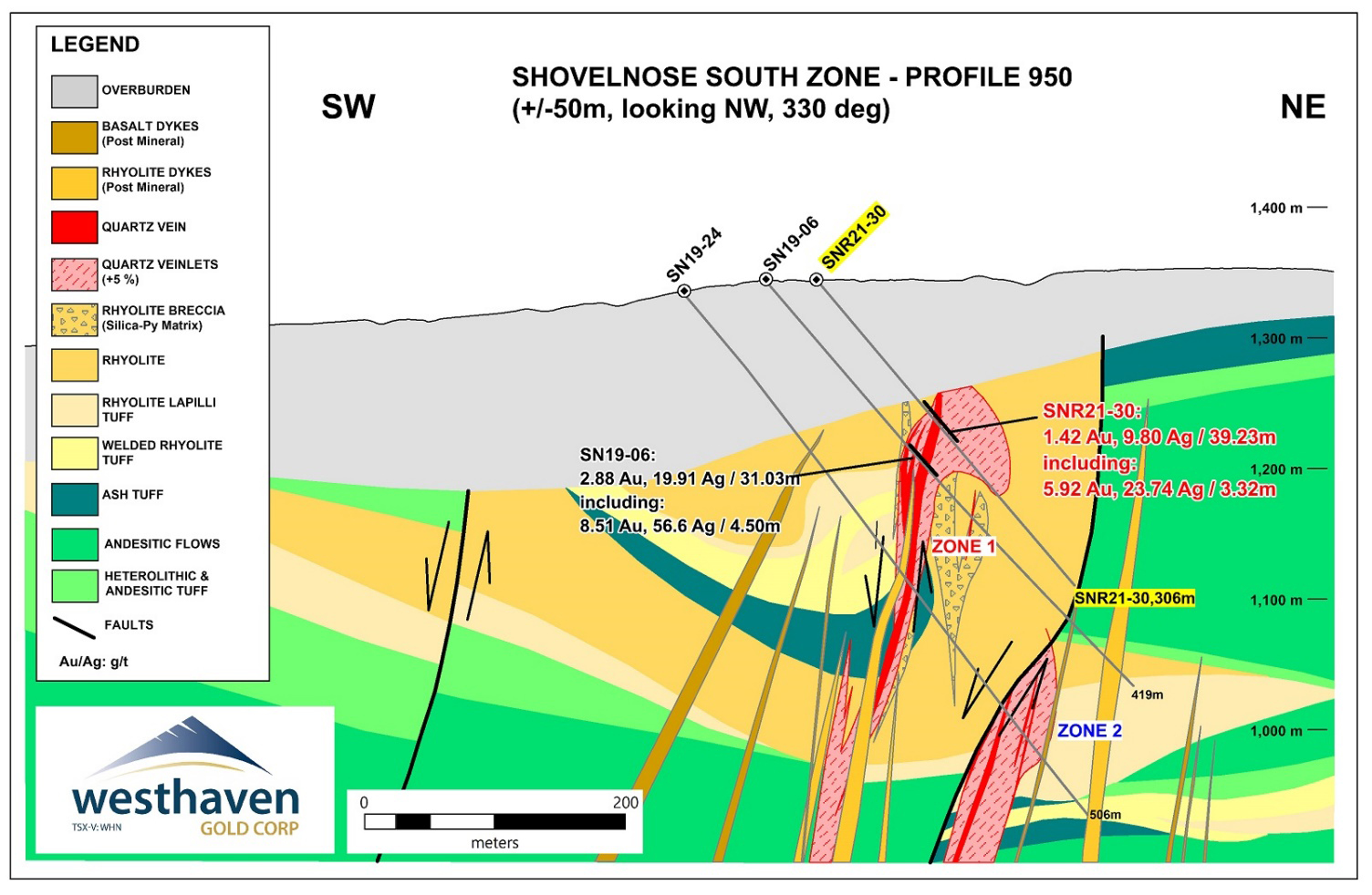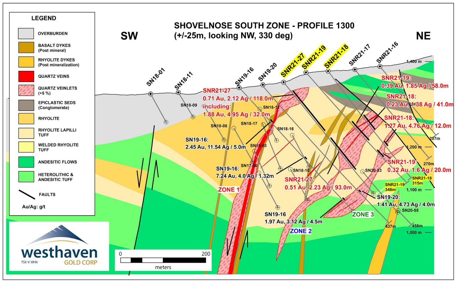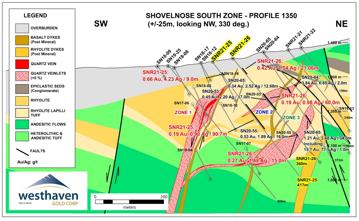 Gold mineralization was also encountered at the top of hole SN21-170 in a second northwest striking zone of chalcedony veining hosted in rhyolite, lying about 100m southwest of Vein Zone 1. This zone was first identified in hole SN20-123, which returned 0.204 g/t Au, 0.345 g/t Ag and 311 ppm arsenic over 16.79m (58.65-75.44m). Hole SN21-170 returned 3.0m of 0.52 g/t Au (12-15m). This zone has now been traced for 350m and remains open to the northwest.