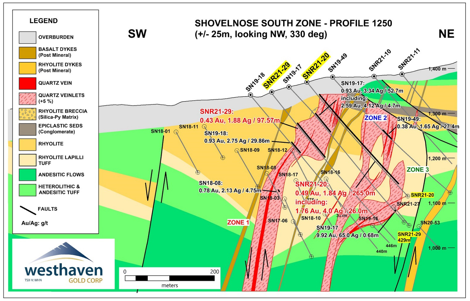 Gareth Thomas, President & CEO of Westhaven Gold, states: “These recent drill results at the South Zone confirm that along with multiple high-grade gold-silver veins, there are also significant widths of disseminated gold-silver. These broad intercepts are expanding the footprint of the known area of gold-silver mineralization. Once drilling resumes, the focus will be on recent vein intercepts (SNR21-37 to SNR21-40), northwest of the South Zone where pale-grey banded quartz with adularia and ginguro were observed in the core; assays pending. We will also be focusing on the FMN Zone, approximately 2.5 kilometres northwest of the South Zone, where assays are also pending.”