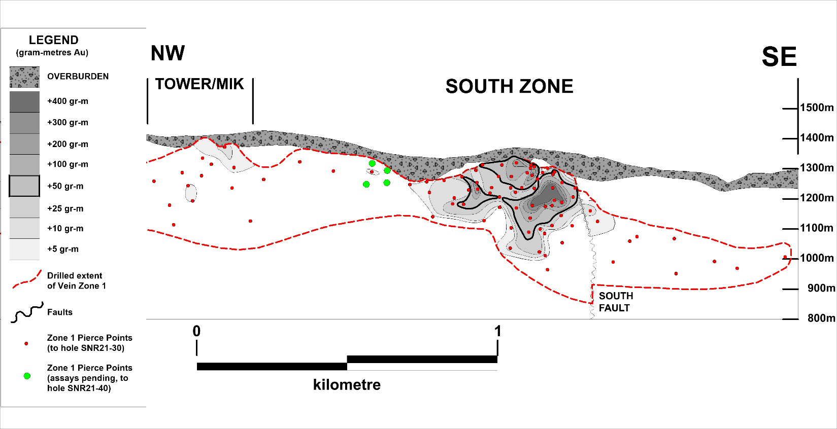 Peter Fischl, Exploration Manager, comments: “Resource drilling at the South Zone has confirmed the continuity of Vein Zones 1, 2 and 3 based on previous broadly spaced drilling from 2018-2020. This drilling has also confirmed the presence of broad intervals of lower grade gold mineralization occurring between Vein Zones 1 and 2. This mineralization is also seen as a halo that can encompass all three vein zones, as seen in hole SNR21-20, which returned 0.49 g/t Au over 265m. The presence of such mineralization adds to the potential for a bulk-tonnage resource at South Zone.”