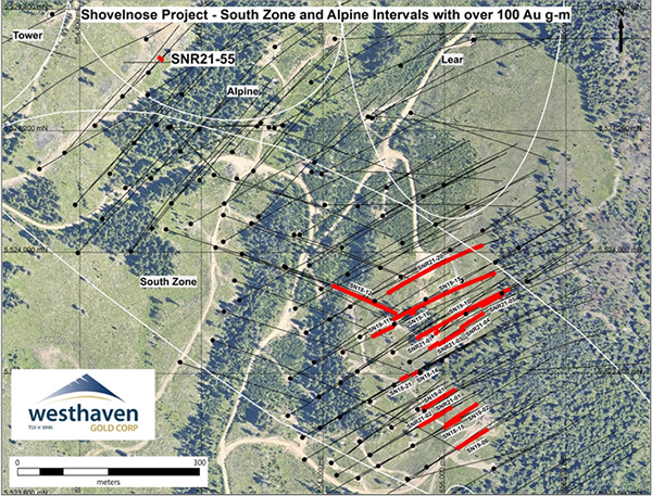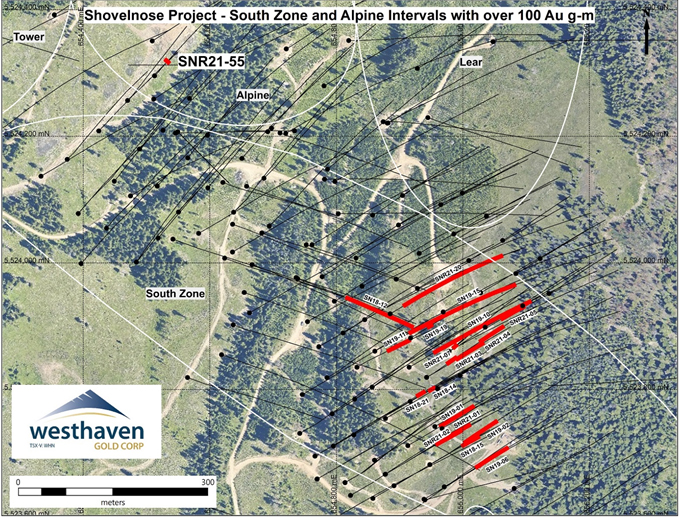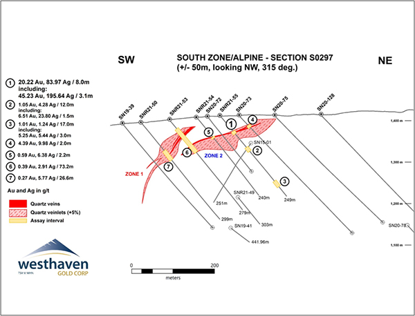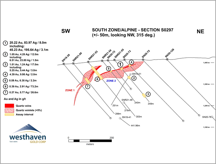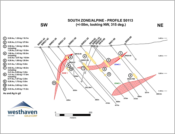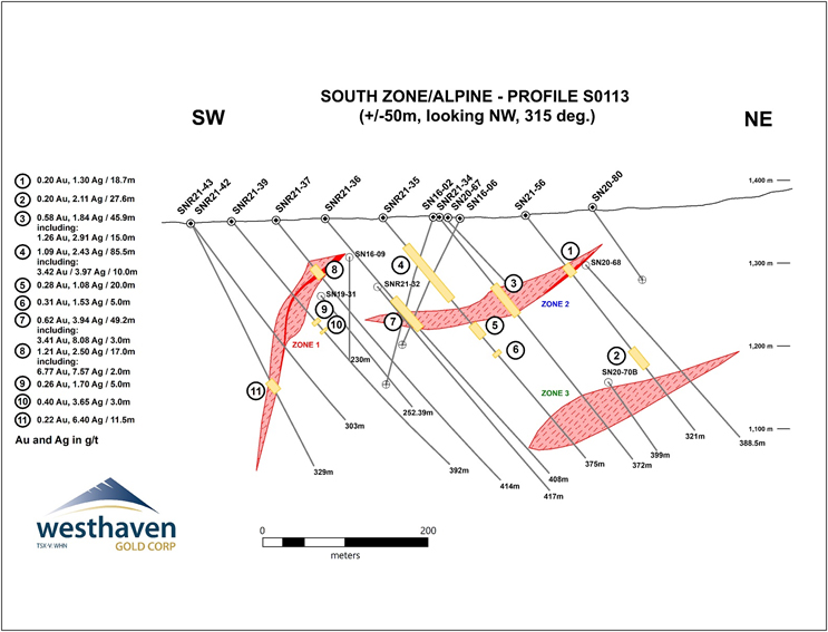 Gareth Thomas, President & CEO, comments: “Hole SNR21-55 (8.00m of 20.22 g/t gold and 83.97 g/t Ag) is a completely new high-grade gold discovery within Vein Zone 2 at the Alpine Zone. This hole is approximately 500 metres from previous high-grade intercepts within Vein Zone 2 at the South Zone. This is very exciting as it remains open to the northwest and gives us a whole new area to focus on.”