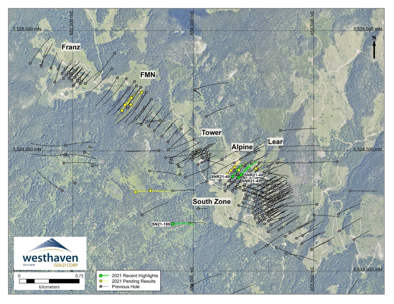 Westhaven is reporting assays for 20 holes from its ongoing drill campaign at Shovelnose. An additional 19 holes are in the lab pending assay as well. Westhaven currently has one drill turning at the FMN target which is approximately 1.5 to 2km northwest of the recently released South Zone in-pit resource. Mineralization at the FMN target has been encountered over a strike length of 480 metres starting at the top of bedrock. Vein Zone 1 broadens up-dip, near surface, with true widths of up to 40 metres as seen in hole SN21-188 (0.76 g/t Au over 57.8m). Drilling at the FMN zone is targeting higher-grade mineralization at the preferred elevation range of 1200 to 1400m over an area extending southeast towards hole SN20-139 and northwest towards and beyond hole SN21-167.