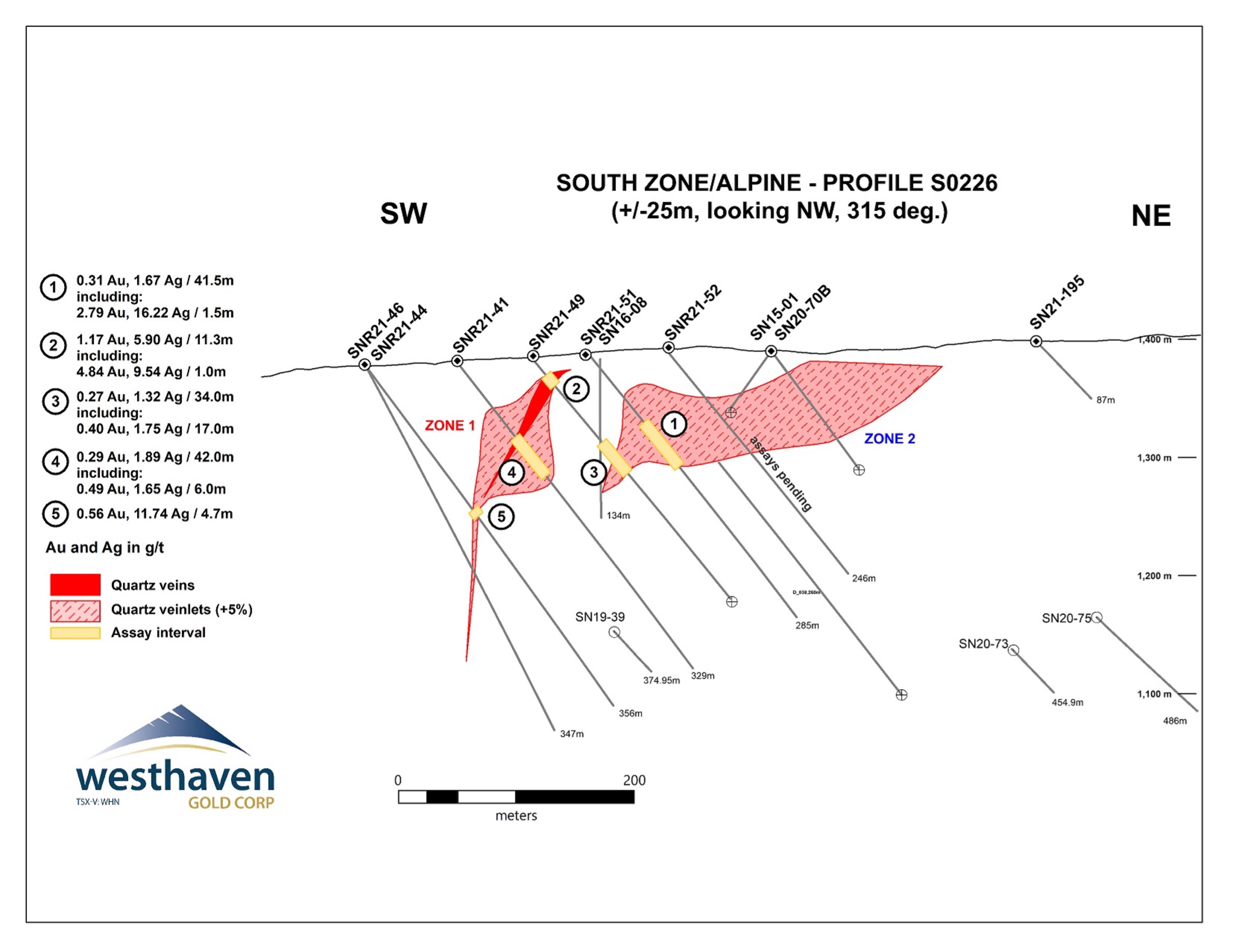 Peter Fischl, Exploration Manager, comments: “Recent drill results at Shovelnose continue to define broad intervals of gold mineralization contained in Vein Zones 1 and 2 and associated halos in the northwestern portion of the proposed open pit at South Zone. These drill results are not included in the recently released open-pit resource of 1.1 million ounces gold-equivalent for South Zone. These broad intercepts confirm the bulk tonnage potential at South. This mineralization remains open to the northeast of hole SNR21-48 (Section S0166), where Vein Zone 2 is interpreted to continue up-dip from this hole. Additional step-out holes are now being planned to test further to the NE along drill section S0166. Additional gold mineralization containing significant silver was intersected in hole SN21-189. This hole was testing a CSAMT (Controlled-source Audio-frequency Magnetotellurics) target. The nature of this mineralization is currently being evaluated.”