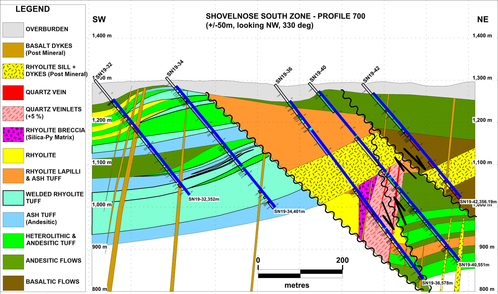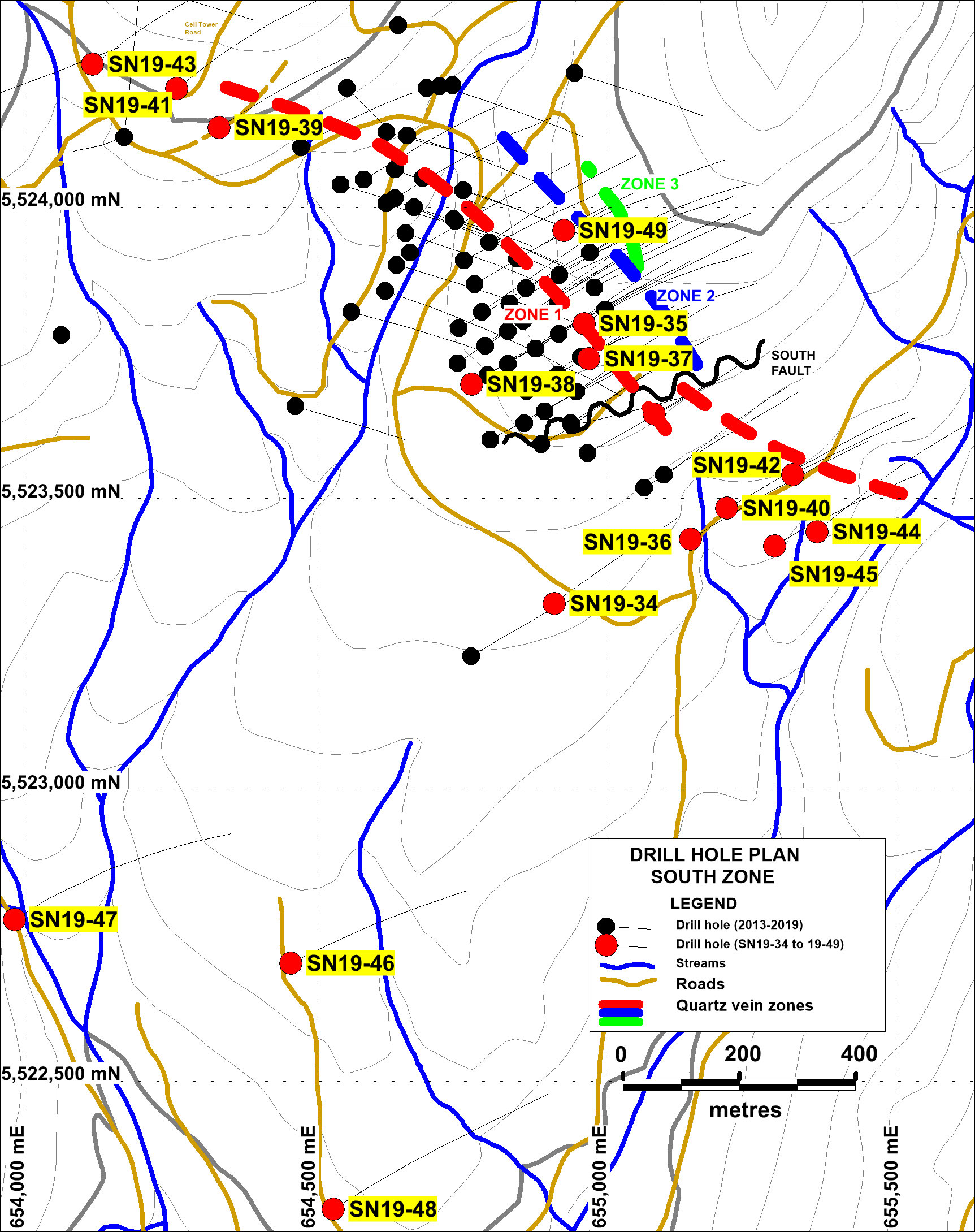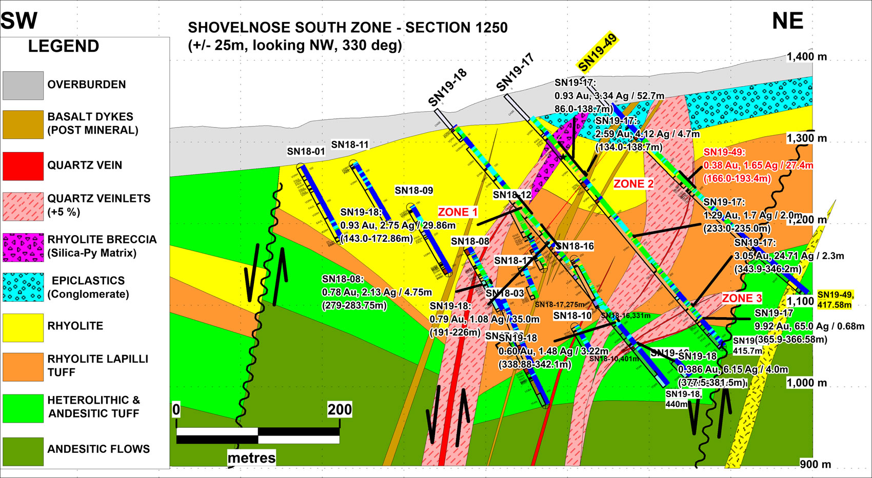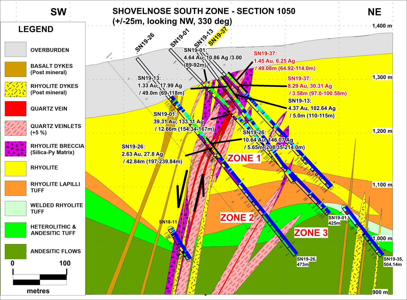 Peter Fischl, Exploration Manager, stated: “Drilling late in 2019 continued to extend Vein Zone 1 to the southeast. The zone remains open along strike beyond hole SN19-45. Initial drilling in 2020 will follow-up to the southeast, stepping out from hole SN19-45. Target A lies proximal to the southeastern most drilled extent of Zone 1. Here an area of dark chalcedony veining and brecciation in rhyolite lies 0.5 kilometre to the east of the southeast end of the drilled extent of Zone 1 and will be targeted as well in this follow-up drilling. A re-evaluation of magnetics and resistivity geophysical signatures in combination with anomalous soil geochemistry has outlined a corridor extending south-southeast from Vein Zone 1 that may be prospective for additional veining and this will be targeted as well.”
