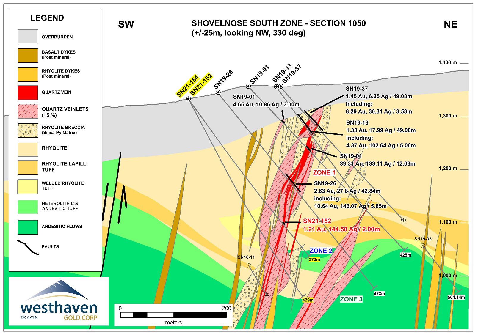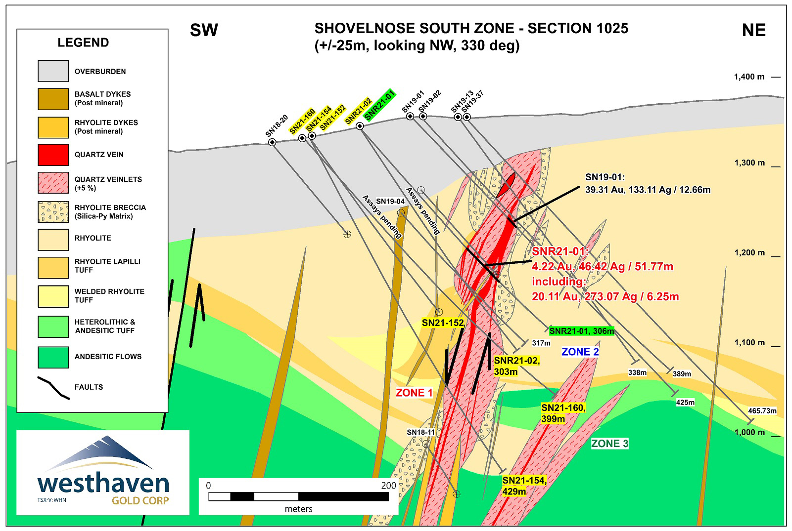Gareth Thomas, President & CEO of Westhaven Gold, states: “In mid-February we began drilling at the South Zone with a view to completing an inaugural independent resource estimate by late 2021. Prior to the 2021 drilling, the South Zone had a low density of drilling having been drilled at roughly 50 metre spacings. The gold grade and vein thickness of drillhole SNR21-01 (27.85m of 7.51 g/t Au and 83.94 g/t Ag), located twenty-five metres between SN18-15 (46.20 Metres of 8.95 g/t Gold and 65.47 g/t Silver) and SN19-26 (15.46 m of 4.80 g/t Au and 61.21 g/t Ag), further demonstrates the continuity and high-grade nature of Vein Zone 1. Roughly 2 kilometres along strike from the South Zone at the FMN Zone, we continue to intersect gold-silver mineralization. Given our proximity to infrastructure, low drilling costs and recently completed bought deal financing, we are fully financed for our 2021 exploration activities.”