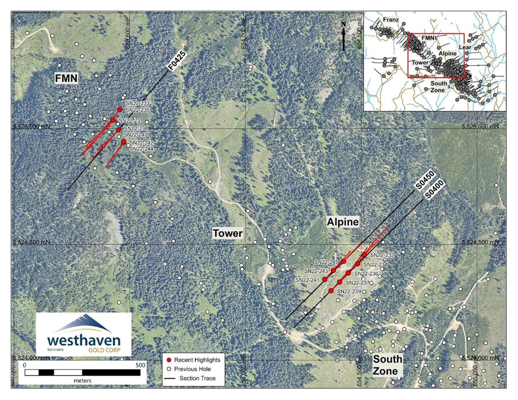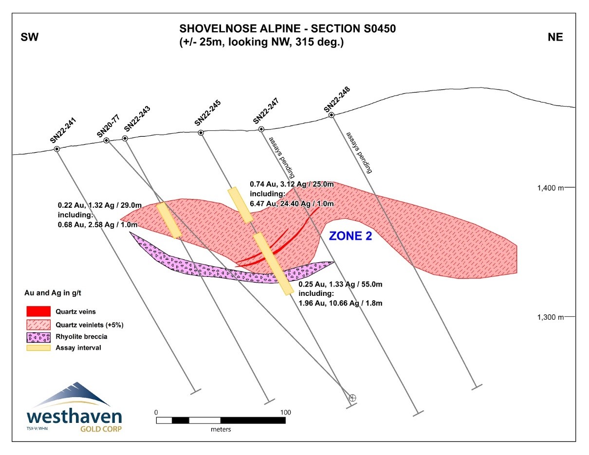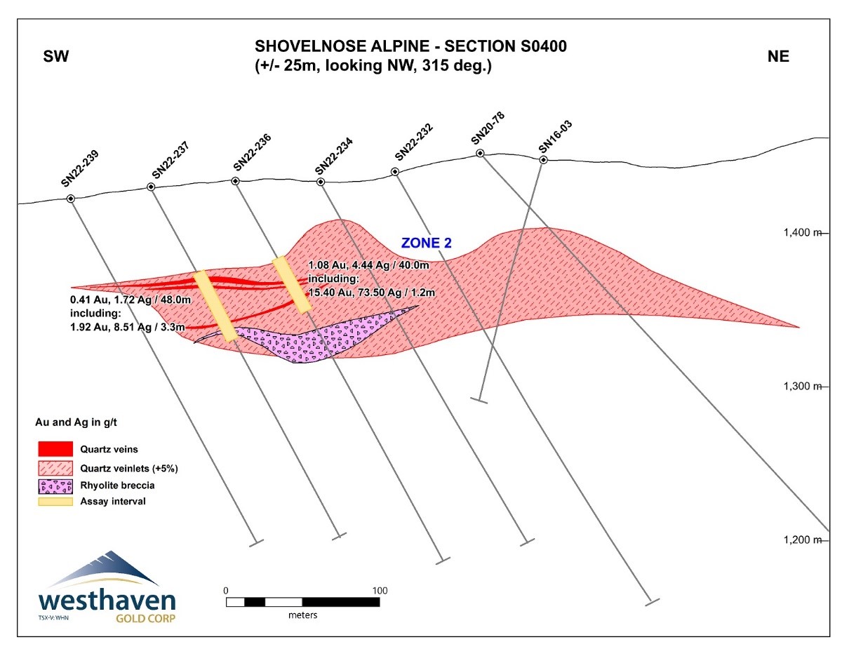 Peter Fischl, Exploration Manager adds: “Drilling at Shovelnose continues at the FMN and Alpine target areas this year. Tighter spaced drilling over Vein Zone 2 at the Alpine target area has intersected significant widths of gold-silver mineralization above the cutoff grade of the open pit maiden resource released earlier this year for the adjacent South Zone target area immediately southeast of Alpine. The shallow and very gently dipping nature of Vein Zone 2 here adds to the open pit potential of the Alpine target area. The mineralization uncovered in the tighter drilling here may have a positive impact to any update to the maiden open pit resource. Infill and step out drilling at FMN continue to yield significant gold intersections in Vein Zone 1 and in post mineral heterolithic breccias that cut Vein Zone 1. The most recent results confirm that the post mineral breccias at FMN can host mineralization over significant widths at shallower levels (e.g.: 0.46 g/t Au over 29.08m in SN22-240, 1.16 g/t Au over 42.17m in SN22-211). The breccias are now considered a secondary target that can add to the bulk tonnage potential at FMN”