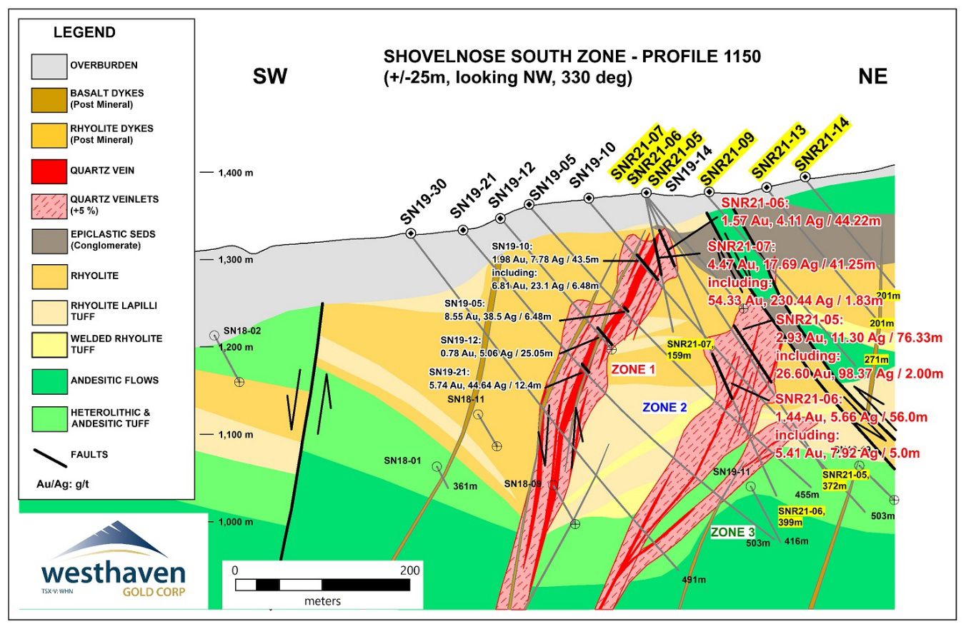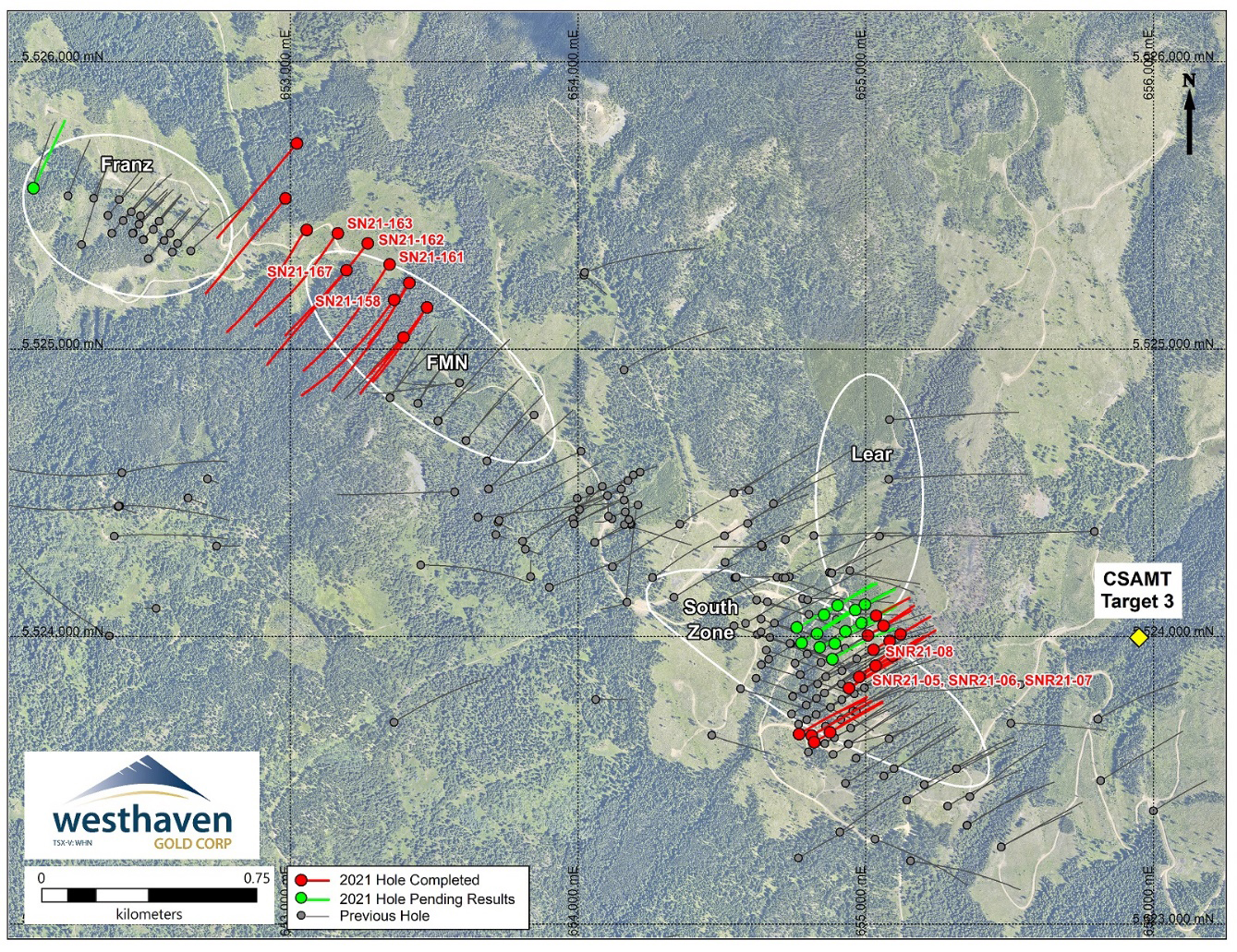 Gareth Thomas, President & CEO of Westhaven Gold, states: “Though still early days at the FMN, 2021 exploration drilling has successfully outlined a 200m corridor of higher-grade zones of gold and silver mineralization starting from hole SN21-158 (3.46m of 9.46 g/t Au and 151.82 g/t Ag) to hole SN21-167 (4.18m of 5.26 g/t Au and 9.27 g/t Ag). Our technical team is getting a better handle on targeting the elevation range of best mineralization, which bodes well for future significant drill intercepts at FMN.” Thomas goes on to add, “The recent South Zone results (76.33m of 2.93 g/t Au and 11.30 g/t Ag) help validate the high-grade nature of this project as we continue to drill outside of this main structure looking for additional zones of gold and silver mineralization. A 3rd drill rig is on site testing these targets now.”