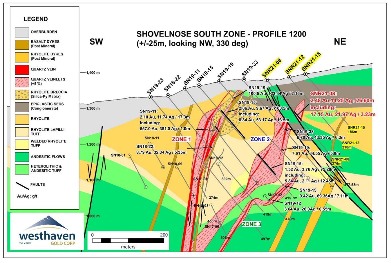 Drillhole SNR21-08 intersected Vein Zone 2 starting at 122m downhole (26.60m of 2.48 g/t Au and 14.25 Ag) and is located 50m NW along strike from drillhole SNR21-05 which intersected Vein Zone 2 starting 181m downhole (76.33m of 2.93 g/t Au and 11.30 Ag). The Vein Zone 1 mineralization encountered in drill hole SNR21-07 (41.25m of 4.47 g/t Au and 17.69 g/t Ag) starts at 51m downhole. Resource holes (SNR21-09 to SNR21-16) were geologic holes drilled as part of the ongoing resource definition program and drilled on the eastern periphery of the South Zone with a view to providing information related to wallrock characterization and condemnation testing.