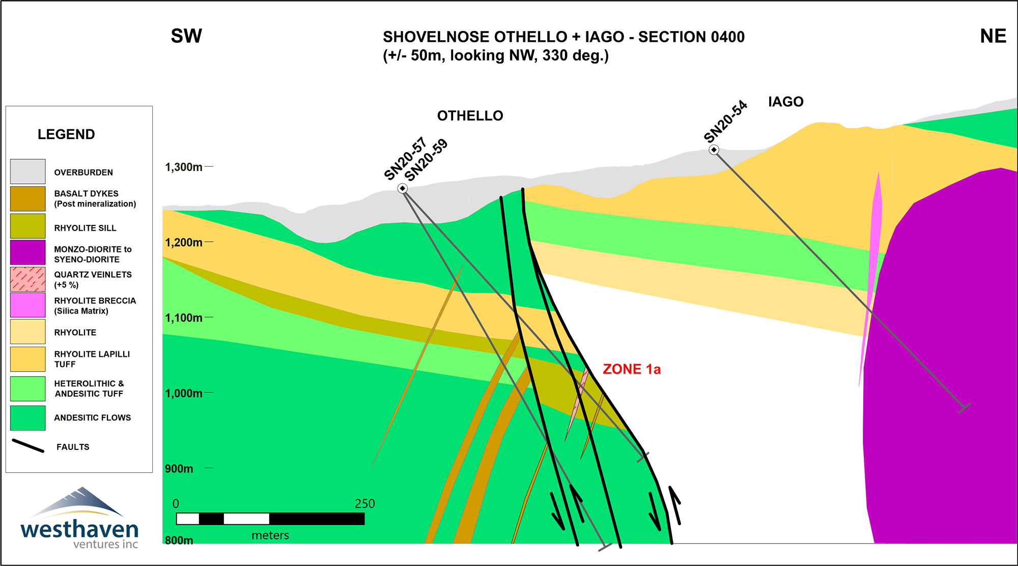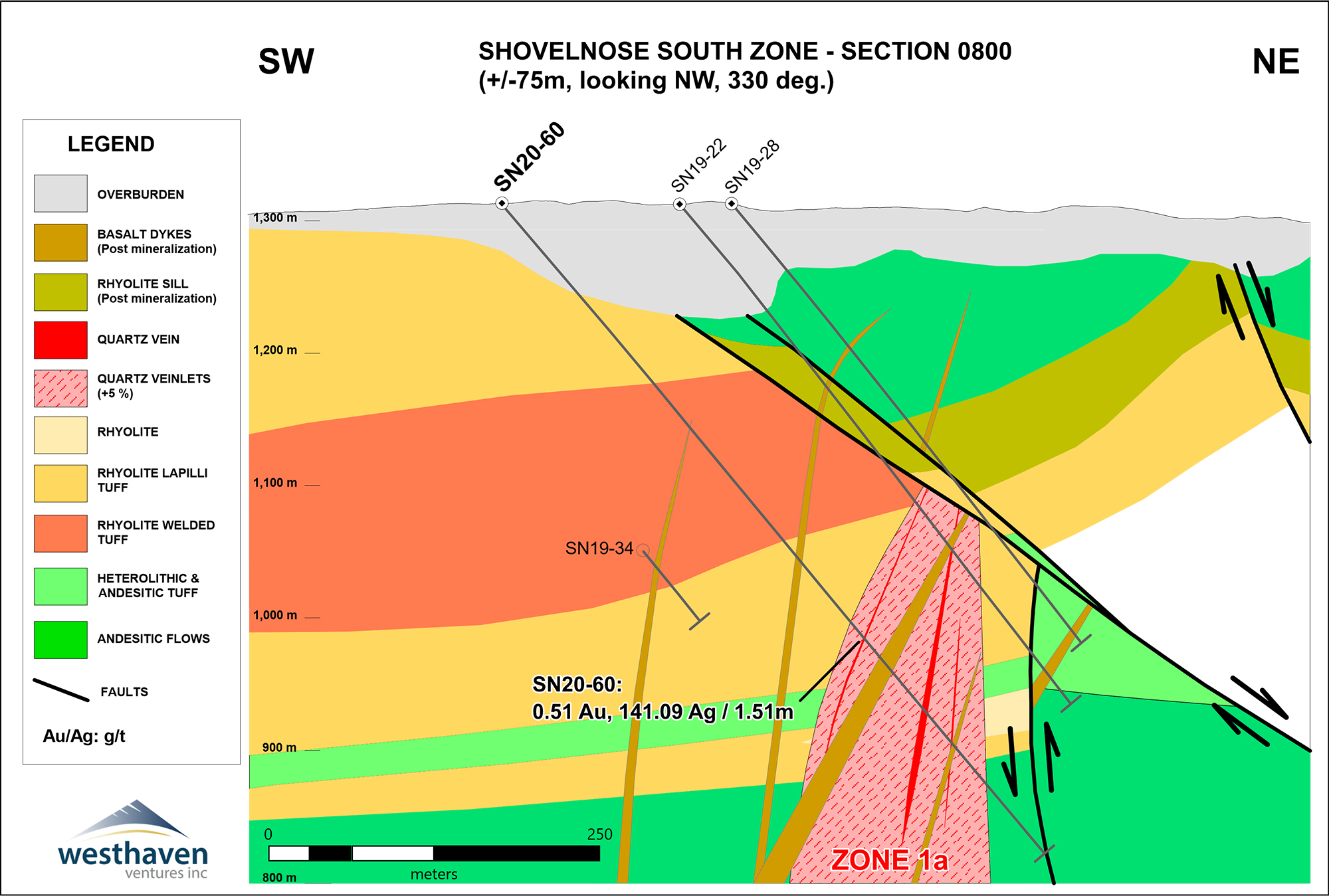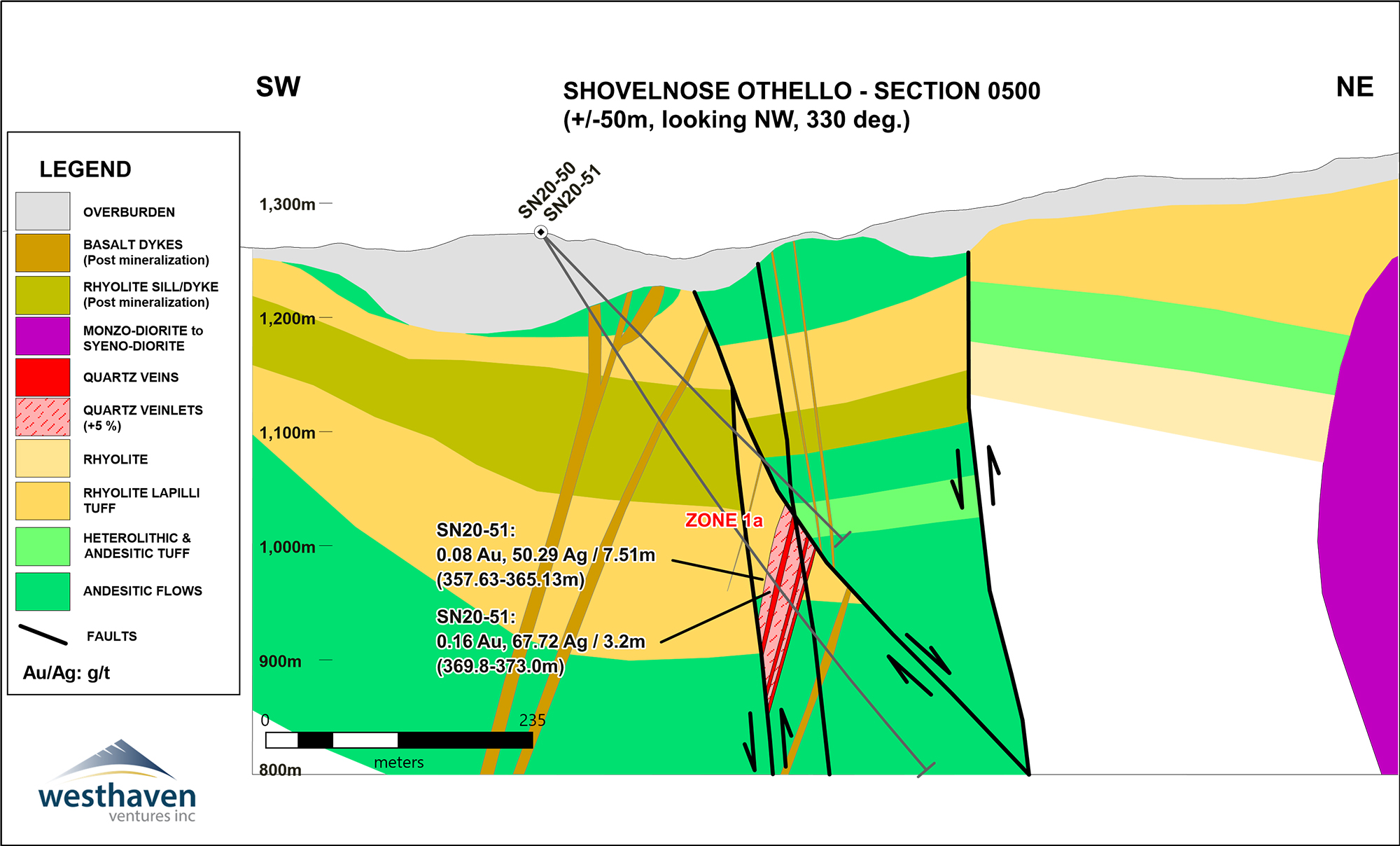 Four holes (SN20-50, 51, 57, 59) totaling 1,985m tested the southeastward continuation of Zone 1. These holes were drilled on two sections spaced 100m apart, extending the vein zone by 200m to a total strike-length of 1.5 kilometres. They encountered two vein zones ~ 40m wide of quartz+/-adularia veinlets hosted in fault-bounded blocks of rhyolite tuff, andesite and minor rhyolite. Where mineralized, these vein zones feature high silver to gold ratios suggesting deeper depths of formation below the horizon of boiling and dominant gold precipitation.