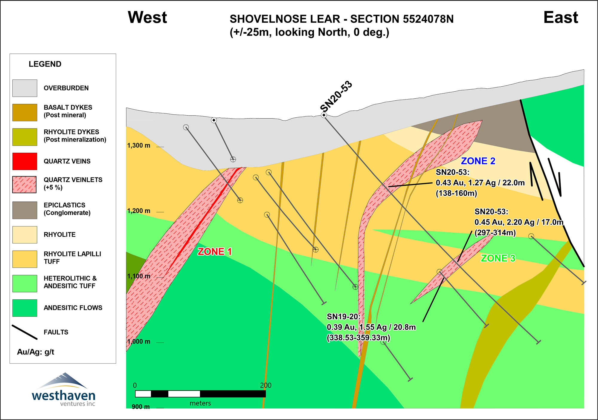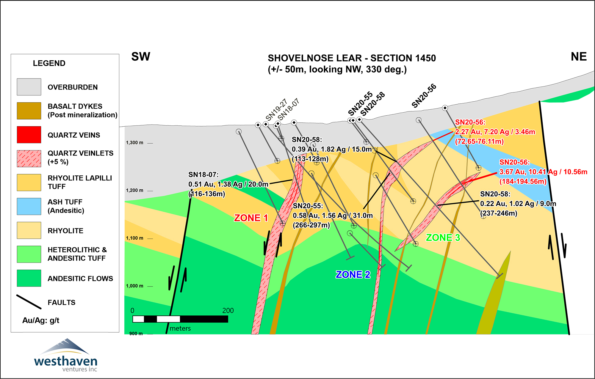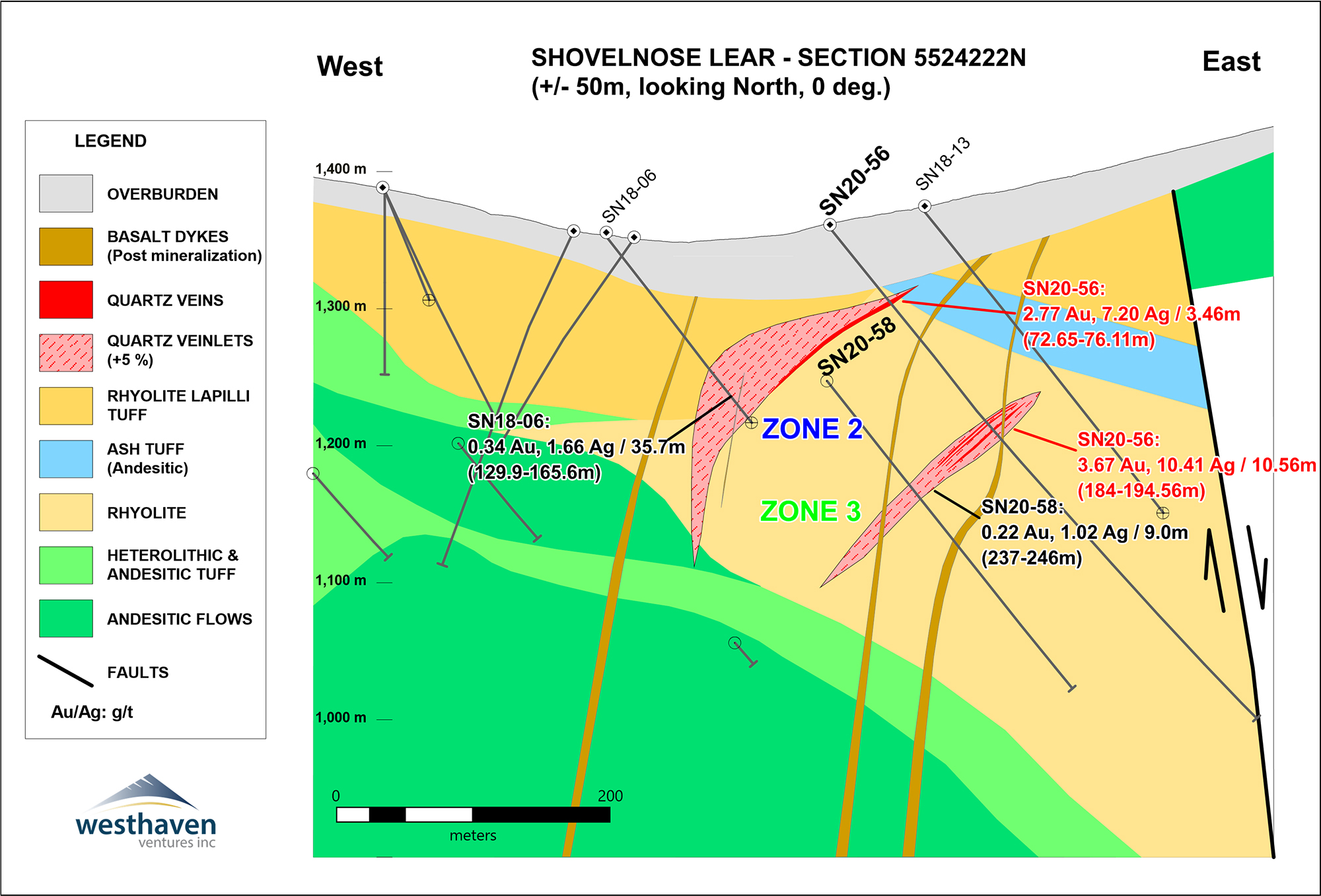 Gareth Thomas, President and CEO of Westhaven, stated: “The 2020 winter drill program hit high-grade gold-silver mineralization on a new target outside of the South Zone. The drill intercepts in the Lear Zone (formerly the North Extension) increase the strike length of the second and third vein zones. Prior drilling to the west/northwest of the Lear Zone, including the Alpine Zone, has demonstrated a significant gold endowment (SN16-02 which intersected 0.50 metres of 16.70 g/t gold, and SN16-07 which intersected 123.00 metres of 0.23 g/t gold). We have yet to identify the source of this gold but upon resumption of drilling we will immediately follow-up on the Lear Zone discovery, as well as drill test many additional high-priority exploration targets across this largely unexplored property.” Thomas goes on to add, “Westhaven continues to prioritize safety and can report that we have no cases of the COVID-19 virus to date. We continue to closely monitor the situation and have implemented virus related safety protocols. We are currently preparing to resume the fully financed drilling activities in mid-May.”