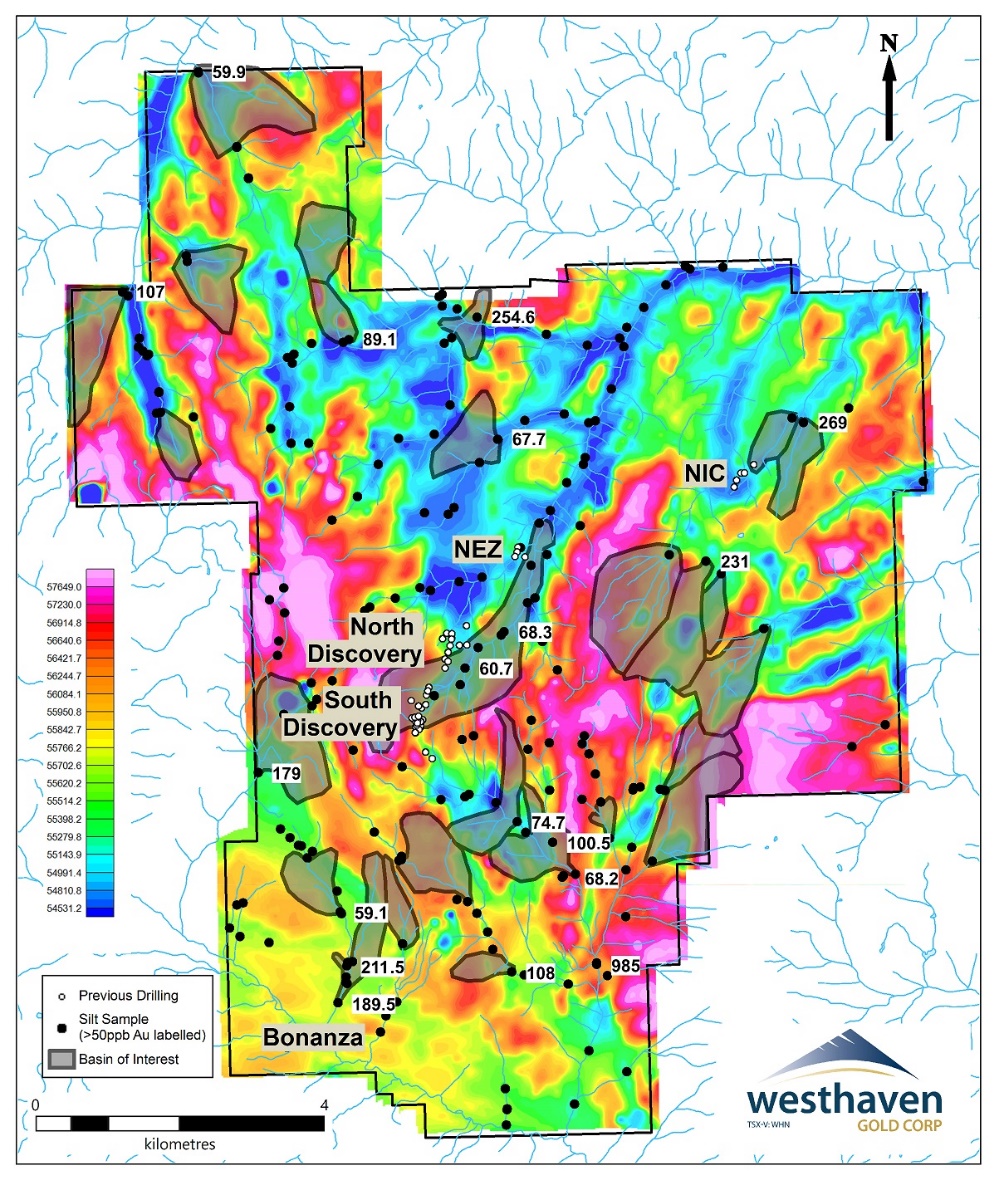 Numerous gold-bearing epithermal quartz vein and breccia float boulders were discovered in 2001-2002 over a two square kilometre area (the ‘Bonanza Target’). The best sample ran 43.34 g/t Au, but the source(s) remains to be determined. Past work on the property targeted bedrock gold-silver showings at the Discovery (North and South), Dogleg, Dome, NEZ and NIC zones by trenching and drilling. The Bonanza Target, Discovery and NEZ are aligned along a north-northeast trend, and are hypothesized to be related to a multi-kilometre scale fault system extending across the property. Westhaven acquired the ground in 2015 and in 2016, collected 1,028 soil and 78 rock samples, re-excavated 4 trenches, and drilled 8 holes (1,519 m) in areas of known mineralization.