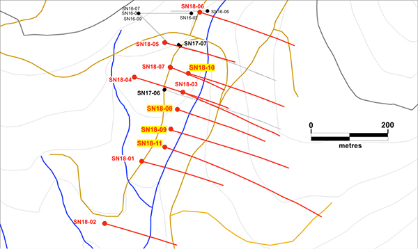 Four holes completed this summer (SN18-08 to 11) tested the northern and southern continuation of mineralized veining encountered in hole SN18-03. All four holes have encountered multiple quartz veins. This drilling has now extended the overall strike of the South Zone vein system to 370 metres and the zone remains open along strike to the north and south. It has now been determined that holes SN18-01 and 02 failed to intersect the southward continuation of the zone due to an apparent change in strike of the veining. Vein intersections in holes 18-08, 09 and 11 indicate an abrupt change of strike to the southeast, well east of holes SN18-01 and 02. This change of strike to the southeast resulted in the vein zone being intersected much deeper than the gold-bearing intersection in hole SN18-03. Follow-up drilling will therefore include testing the up-dip portions of the vein system east and southeast of hole SN18-03.