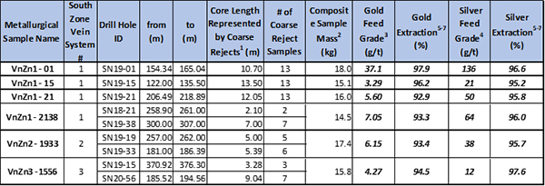 Westhaven prepared six composite samples for preliminary metallurgical work from archived jaw crushed coarse (>70% passing 2mm square mesh sieve) ‘reject’ drill core material associated with routine sampling activities. This crushed drill core should be sufficient for scoping level testing, but there may be some degradation in the performance of the samples during testing. Westhaven has collected additional drill core from the South Zone during 2021 and, once the maiden mineral resource estimate has been completed, this fresh uncrushed core would be available for additional metallurgical testwork beyond scoping levels. Samples ranged from 14.5 to 18.0kg each (combined total of 97 kg), with four composite samples submitted to ALS Metallurgy Kamloops from Vein Zone 1 mineralization, and one each from Vein Zones 2 and 3. Results of two tranches of test work completed in 2021 are compiled in the table and figure below. A point form summary of the two metallurgical test results is also provided.