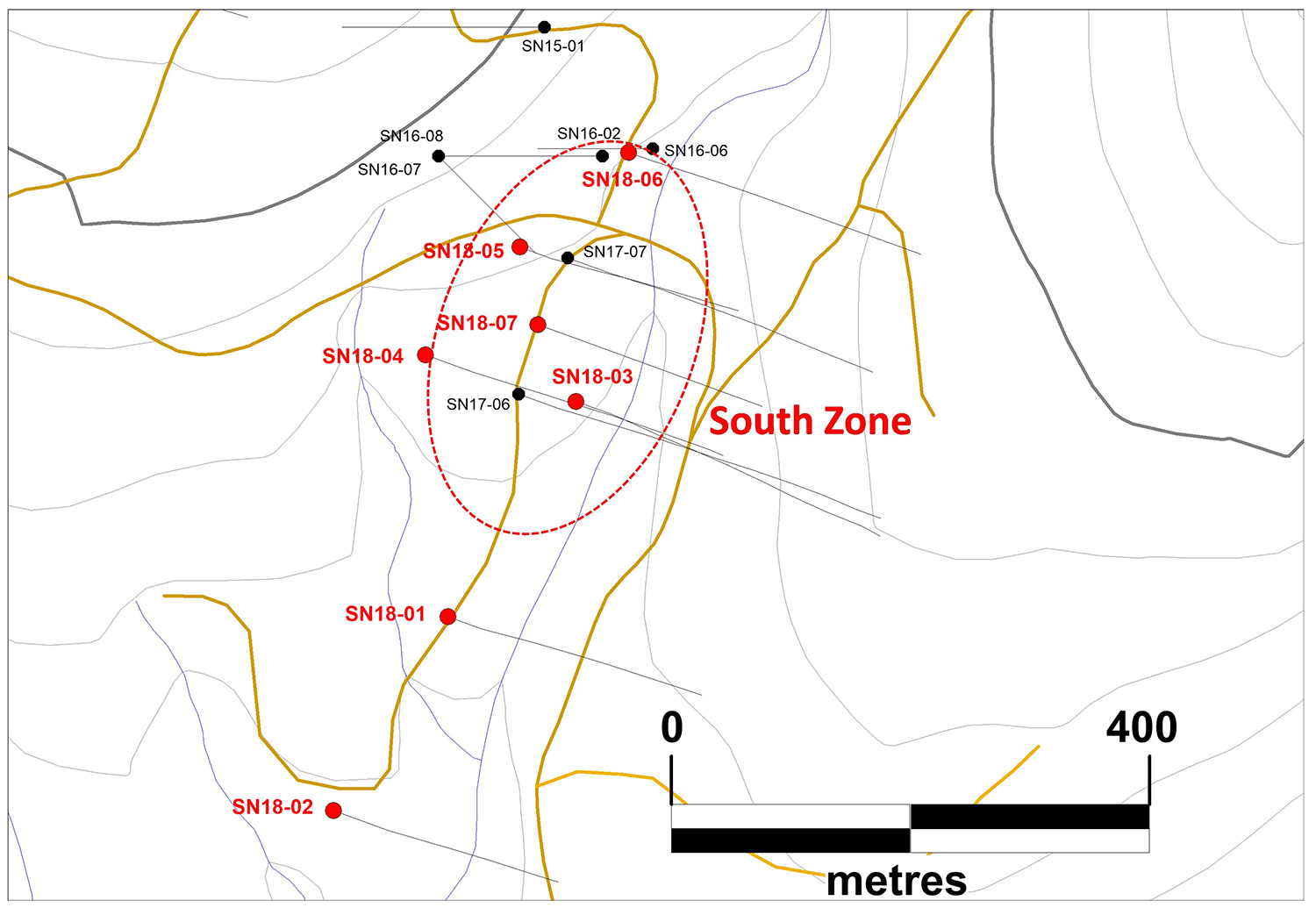 * As previously reported, holes SN18-01 and SN18-02 were drilled in a separate area along strike 200m-400m to the south. Please see map below.