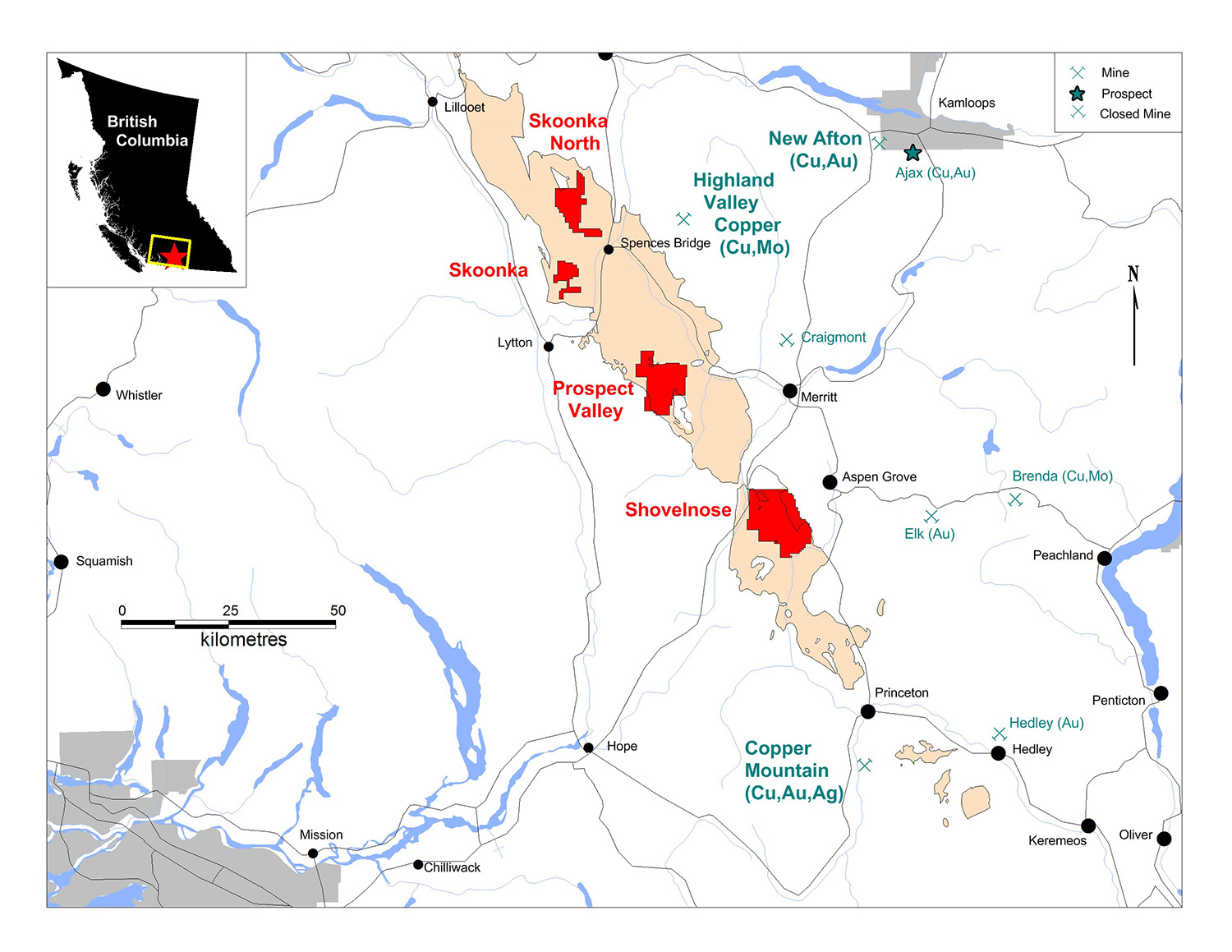 The Skoonka North claims are located northwest of Spences Bridge in south-central British Columbia, less than 3 km from the Trans-Canada Highway and the CN and CP Railway line, and an approximate 3 ½ hour drive from Vancouver in southern British Columbia. They are approximately 10 km north of the Company’s Skoonka property, where past drilling encountered 12.8 m of 20.2 g/t Au. The Skoonka North claims have the highest gold silt samples on the SBGB, including 594 parts per billion (ppb) Au, 383.7 ppb Au, and 131.3 ppb Au. The claims have seen limited exploration work and have yet to be drill tested.