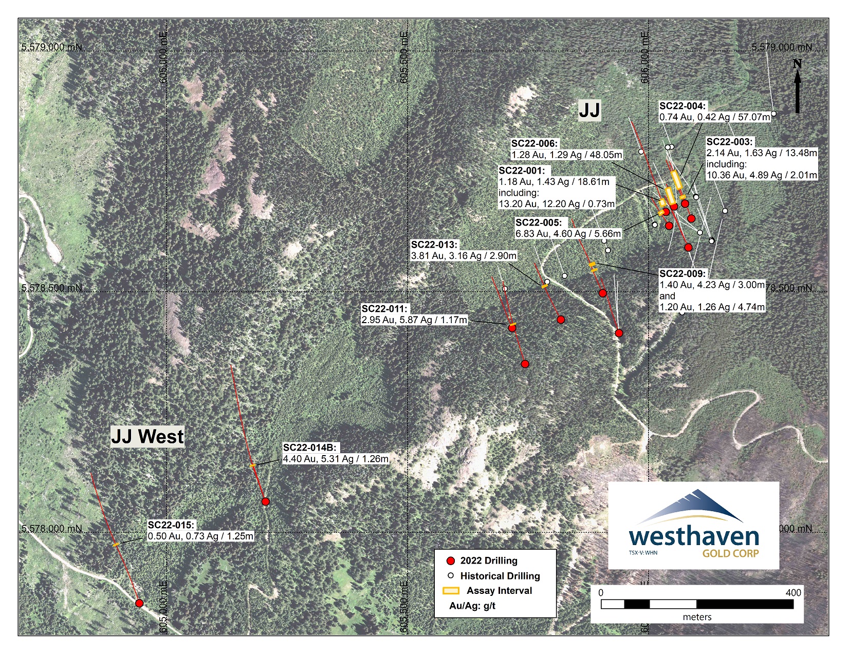 - three drill holes collared in 2022 at JJ West successfully intersected the JJ vein zone some 600m southwest of the nearest JJ holes, and then again an additional 300m to the southwest (SC22-014B and SC22-015 respectively)