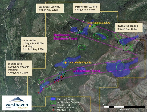 An archeological survey over additional potential drill targets was completed in 2023, but forest fires in each of 2023 and 2024 prevented ready access to the claims. Subsequent evaluation of historical data has identified new targets for mapping, prospecting, sampling and geophysical surveys. Westhaven plans to continue exploration on the property to develop and prioritize potential drill targets as soon as logistical conditions return to normal. Some of the more interesting mineralized showings are summarized below.